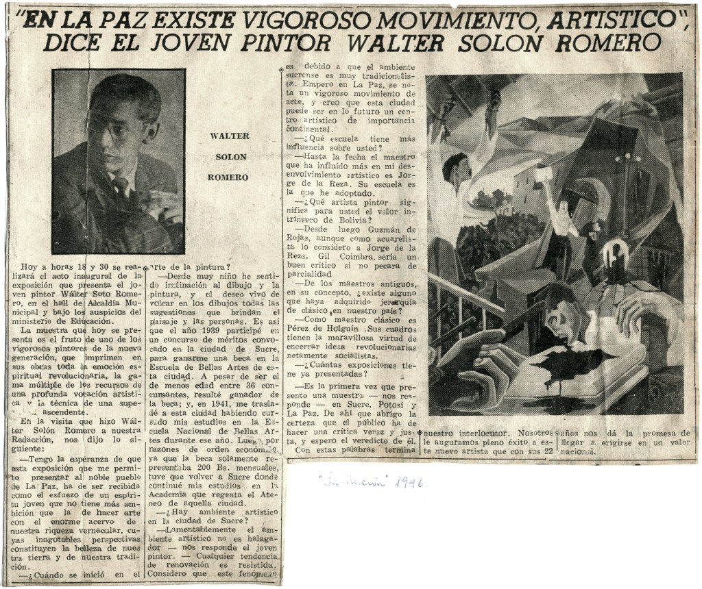 Lamentablemente el ambiente artístico no es halagador – nos responde el joven pintor -. Cualquier tendencia de renovación es resistida. Considero que este fenómeno es debido a que el ambiente sucrense es muy tradicionalista. Empero en La Paz, se nota un vigoroso movimiento de arte, y creo que esta ciudad puede ser en lo futuro un centro artístico de importancia continental.
