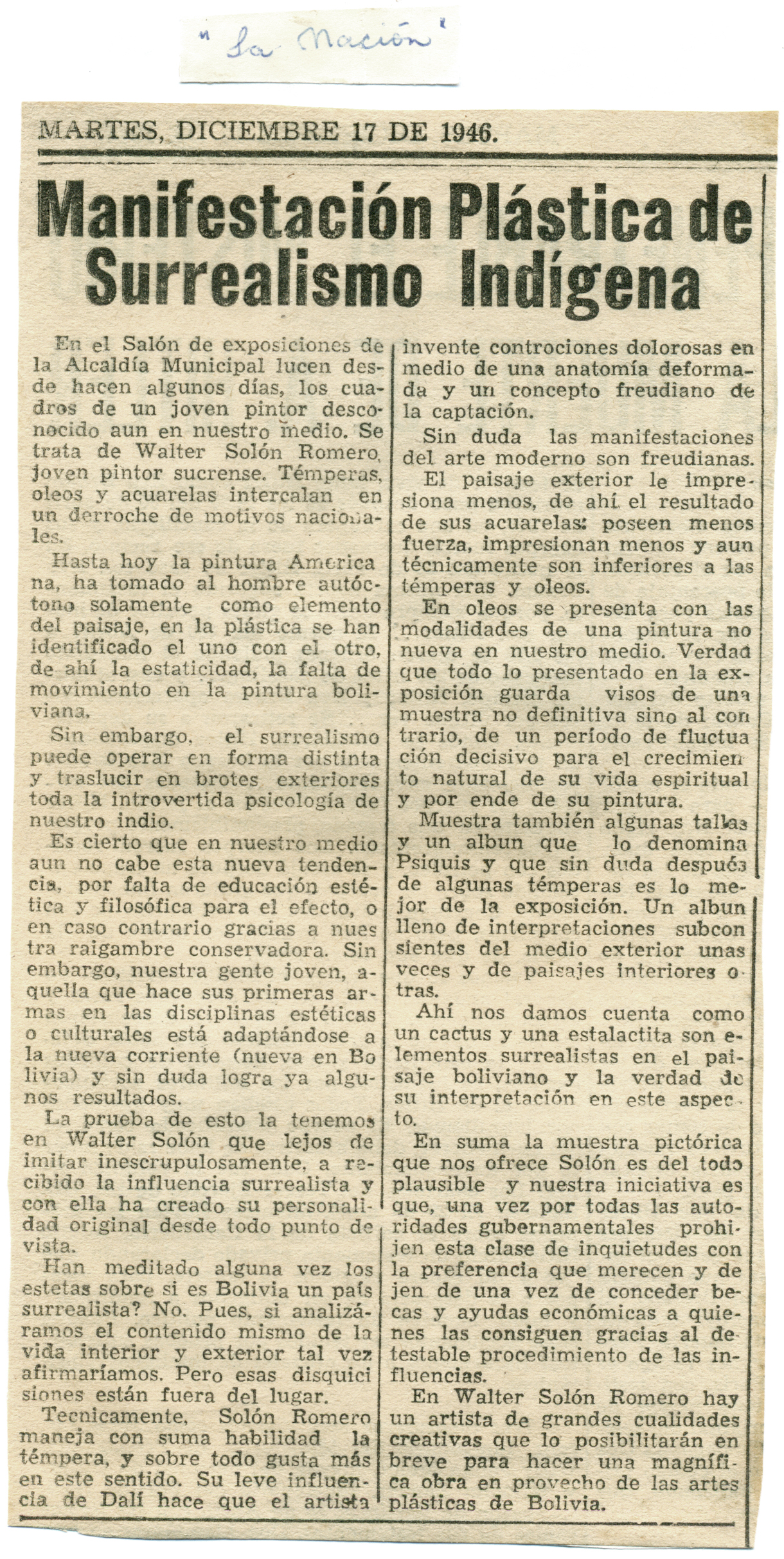 La prueba de esto la tenemos en Walter Solón que lejos de imitar inescrupulosamente, ha recibido la influencia surrealista y con ella ha creado su personalidad original desde todo punto de vista.