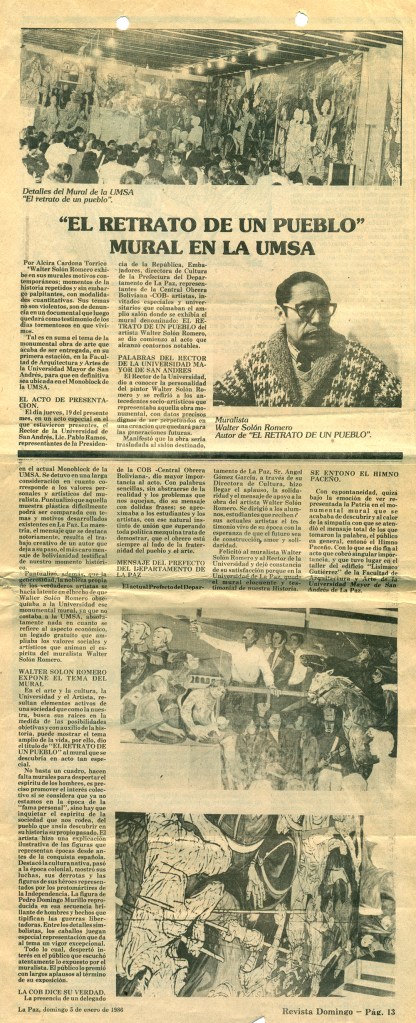 Walter Solón Romero exhibe en sus murales motivos contemporáneos; momentos de la historia repetidos y sin embargo palpitantes, con modalidades cuantitativas. Sus temas no son violentos, son de denuncia en un documental que luego quedará como testimonio de los días tormentosos en que vivimos. Tal es en suma el tema de la monumental obra de arte que acaba de ser entregada, en su primera estación, en la Facultad de Arquitectura y Artes de la Universidad Mayor de San Andrés, para que en definitiva sea ubicada en el Monoblock de la UMSA.