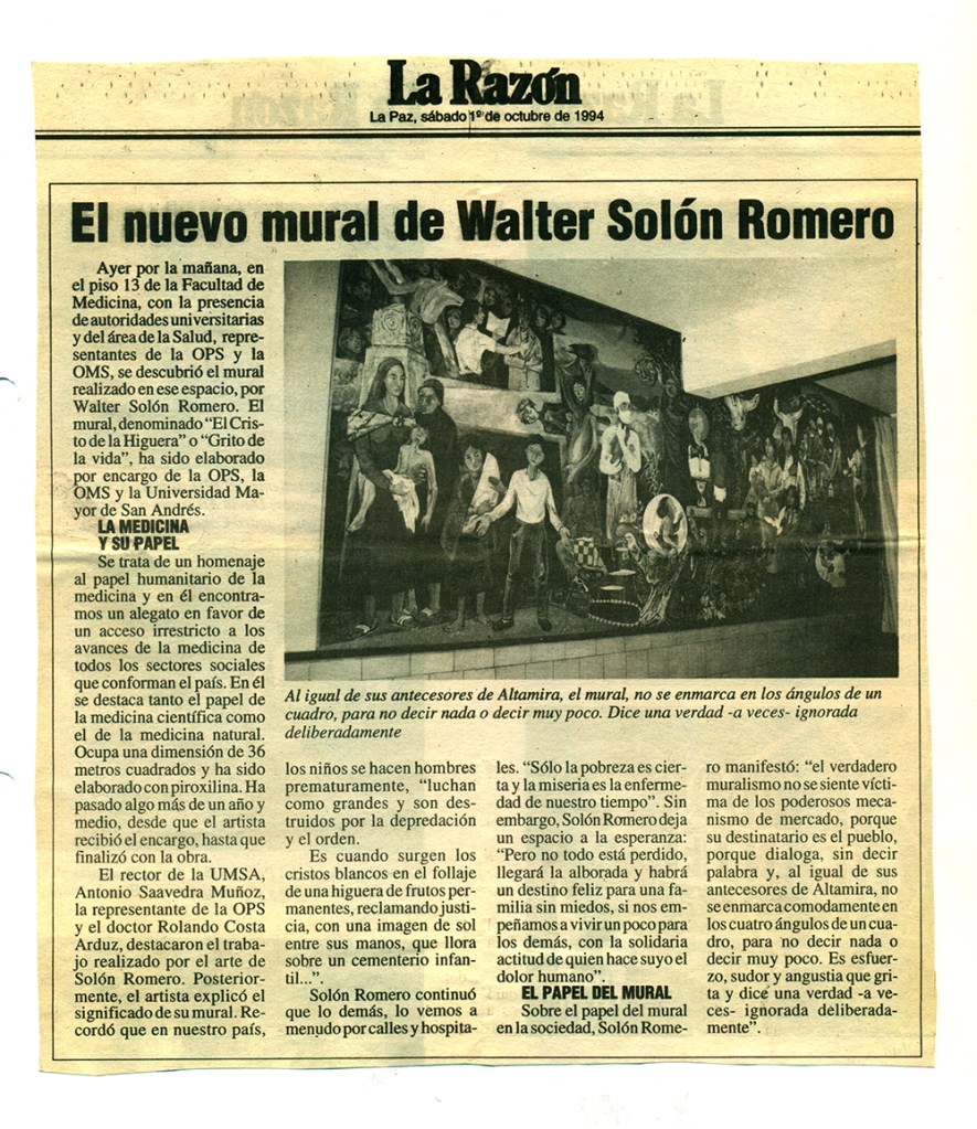 Ayer por la mañana, en el piso 13 de la Facultad de Medicina, con la presencia de autoridades universitarias y del área de la Salud, representantes de la OPS y la OMS, se descubrió el mural realizado en ese espacio, por Walter Solón Romero. El mural, denominado «El Cristo de la Higuera» o «Grito de la vida», ha sido elaborado por encargo de la OPS, la OMS y la Universidad Mayor de San Andrés.