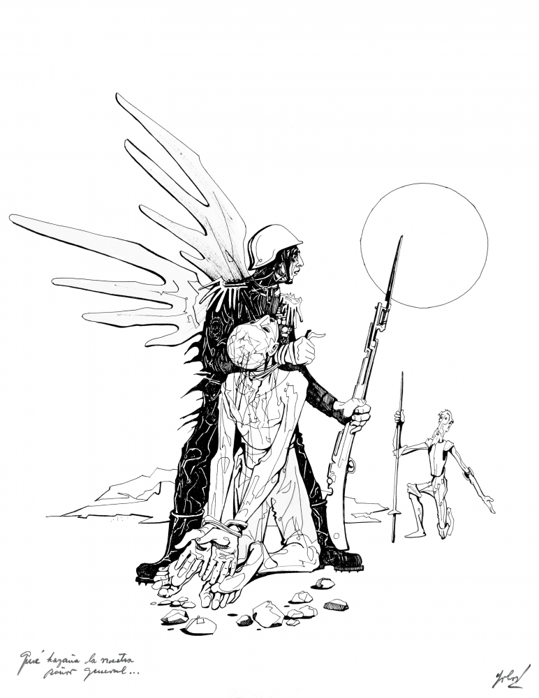 Un inconcluso mural que pinté con los alumnos en la carrera de Artes sobre Juana Azurduy de Padilla y las guerrillas, junto a las láminas de «El Quijote y los Perros» es descubierto en 1980 por la dictadura y son el pretexto para detenerme en la sección segunda del cuartel de Miraflores y sufrir el escarnio de la prepotencia y el odio. Gracias a organismos internacionales y a la embajada de Alemania, logro salir al exilio, es entonces cuando aparece «El Quijote en el Exilio«. Confieso que en la prisión, no sólo fue el perfil de lineas escondidas en los pliegues de mi oficio de pintor lo que me hizo fuerte, fue la cólera, el dolor y la angustia de la amenaza de fragmentar mis manos por decir lo que habría de callar para seguir viviendo. Esta es una revelación que no la he hecho nunca, y que motivó el nacimiento de la serie «El Quijote y los Angeles» cuando años mas tarde comprobé que se declaraban inocentes y libres de toda culpa en los juicios que les hicieron. Cuando aun me queda tiempo para reseñar esta cómplice intimidad que ya dura medio siglo con el Quijote -que no ha perdido la memoria- creo tener la libertad de confesar que he convertido en mis pinturas las piedras del camino en testigos oculares de cuanto ellas vieron y que por eso arañe el papel, la tela, y la muralla para expresar lo que han visto. Convoco a ustedes a reflexionar y juzgar sino es cierto.
