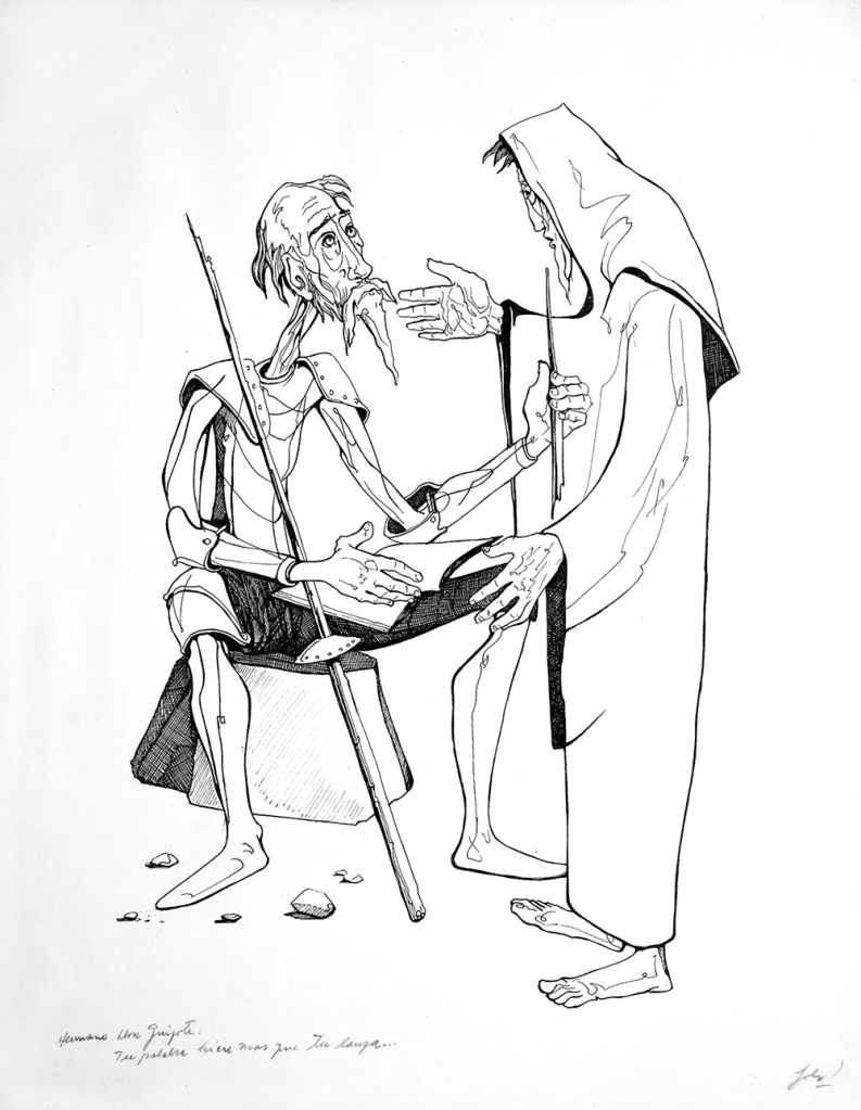 N.B.: Destacaría, antes de seguir, la simplicidad y facilidad gráfica con la que Solón Romero presenta a Don Quijote como interlocutor -ya no origen- de las reflexiones a lápiz que van al pie de los cuadros. También, es cierto, cuando los ángulos o la situación en algunas escenas lo requieren, las expresiones incluyen el nombre del interlocutor y, por consecuencia, nosotros, los observadores reconocemos la fuente de la expresión. Antes de dejar esta digresión, ilustrémosla con este diálogo donde San Francisco tiene, sin duda alguna la palabra (“Hermano Don Quijote/Tu palabra hiere más que tu lanza”):
