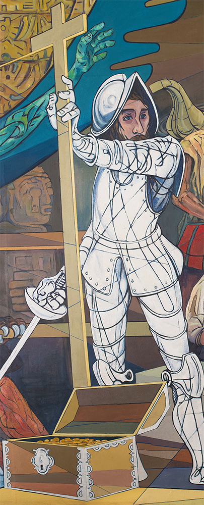 The Spanish in white, the sword and the cross mark the beginning of the conquest. A conquest that according to Solon has not ended and that continues in multiple ways.