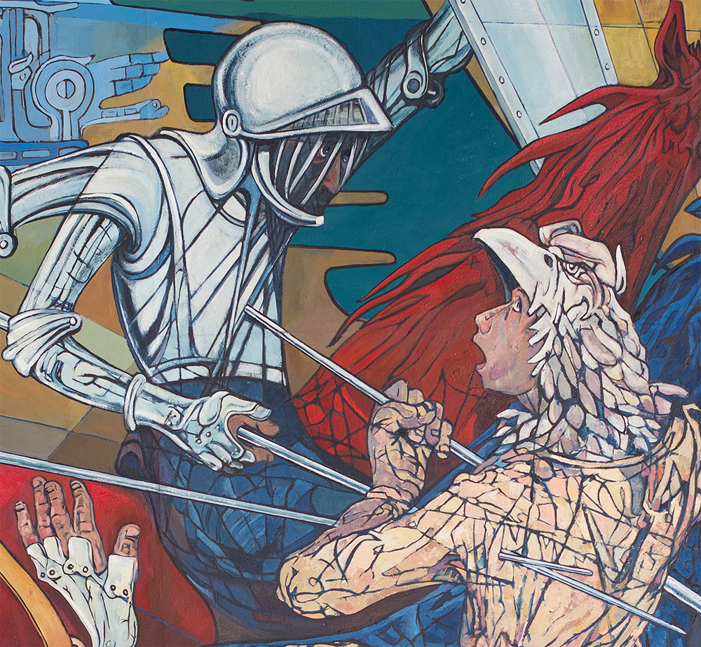 Next, we have the image of the conqueror and the native who mutually stick his spears. Solón wants to express with these images the complexity of the conquest process in which both winners and losers undergo uneven transformation processes.