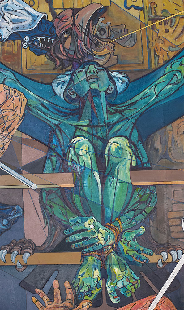 In front of the door of the sun of Tiahuanaco, Solón portrayed one of the most painful tortures that the Spaniards implemented, tying up the indigenous people in this way. The figure of the man in green represents at the same time the suffering and the desire for freedom.