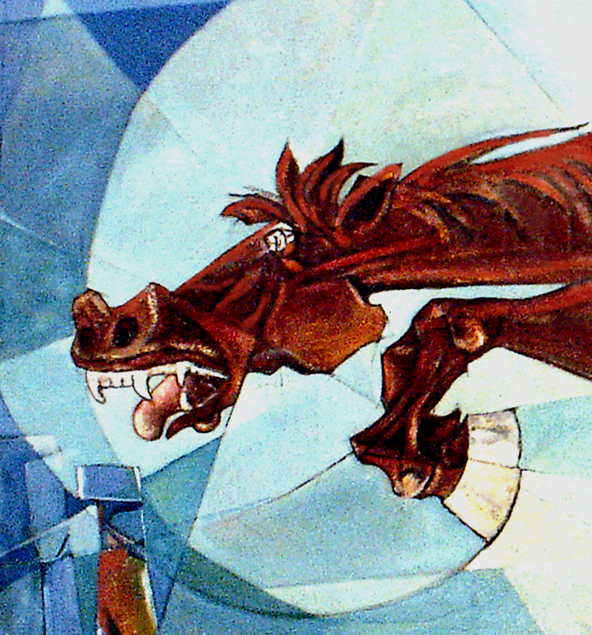 This mural recounts the arrival of Don Quixote to the city of Illimani. The dynamic perspective with big protagonists jumping from the walls stands out in both murals.