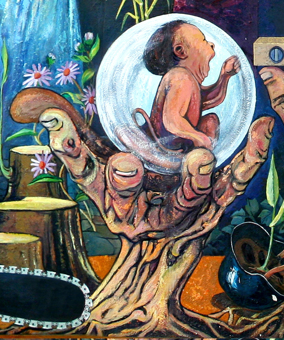 En este mural el obstinado fruto de la tierra se convierte en un grito, en un grito de vida de un niño entre manos y raíces. Este a veces se hace hombre, a veces, casi siempre el hambre y la miseria lo convierten en un habitante de una diminuta tumba blanca. Ojalá que este grito nos evoque el día en que llegamos nosotros con la misma ansiedad de vivir y hagamos algo.