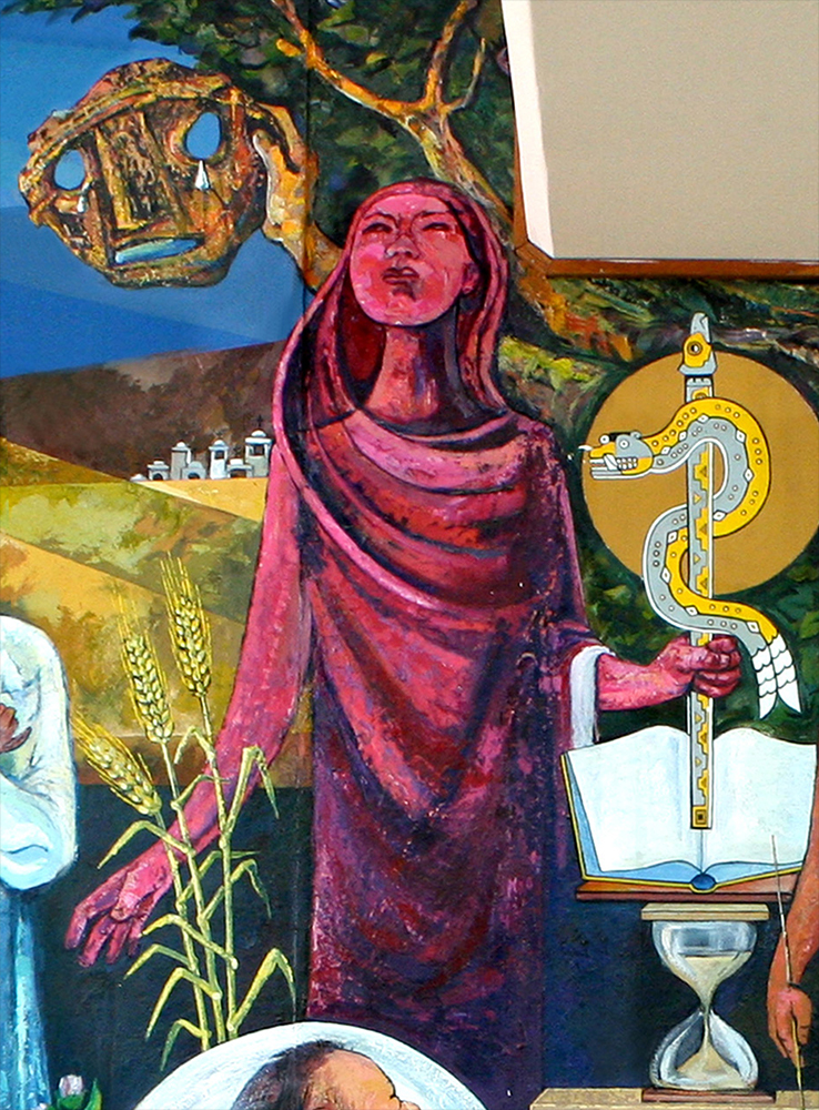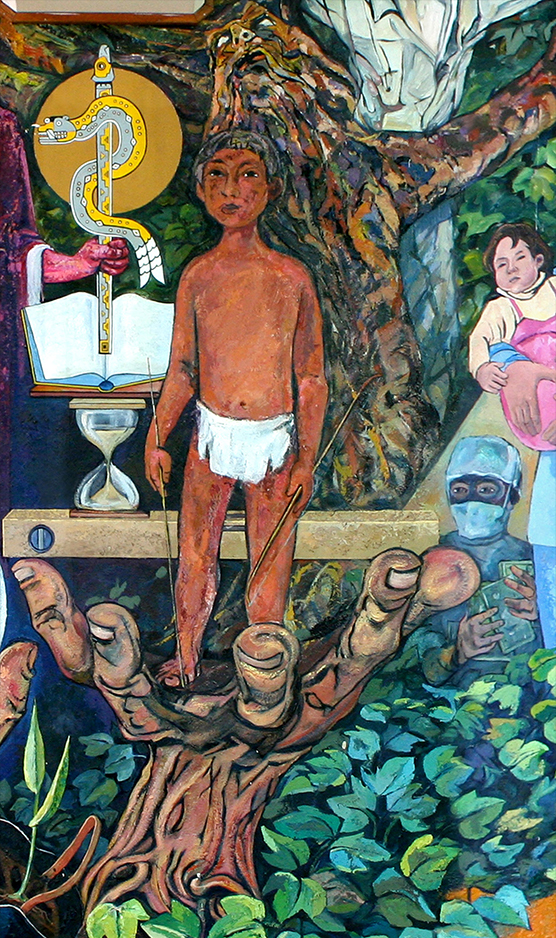 In this mural the obstinate fruit of the earth becomes a cry, a cry of life of a child between hands and roots. This child sometimes becomes a man, sometimes, almost always hunger and misery make him an inhabitant of a tiny white tomb. May this cry evoke us the day we arrive with the same anxiety to live and will lead us to do something.