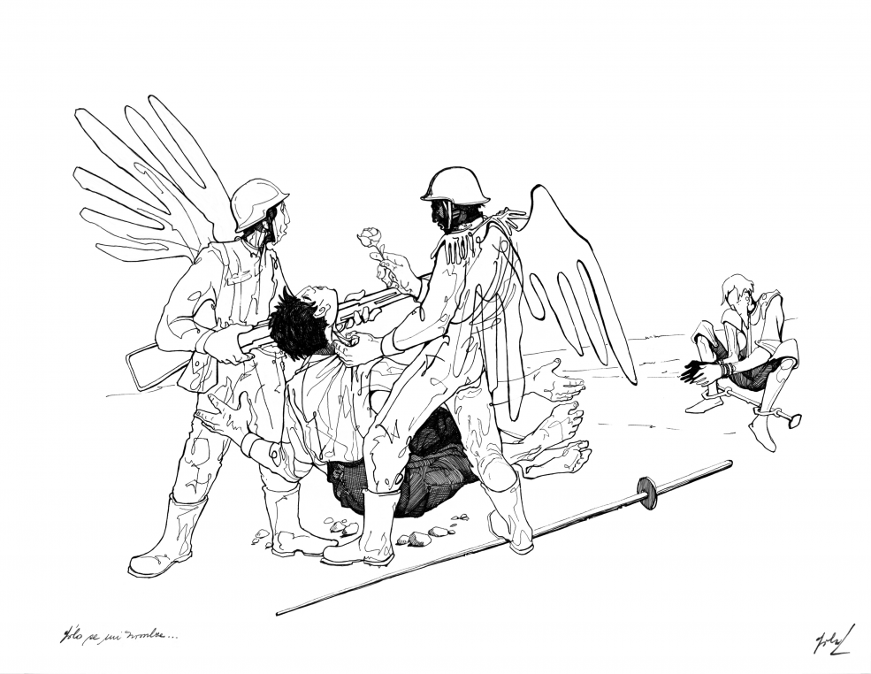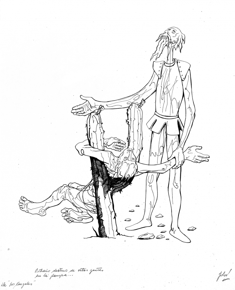 Don Quixote and the Angels is Solon’s most surrealistic series of drawings and yet it is one of the most up-to-date. The angels are the military and politicians of the dictatorship who have been recycled into democracy. The angels are the most difficult adversaries to overcome for Don Quixote. They pretend not to remember anything, they mock justice and are the embodiment of impunity. The angels corrode him inside, demoralize him and steal his hopes…