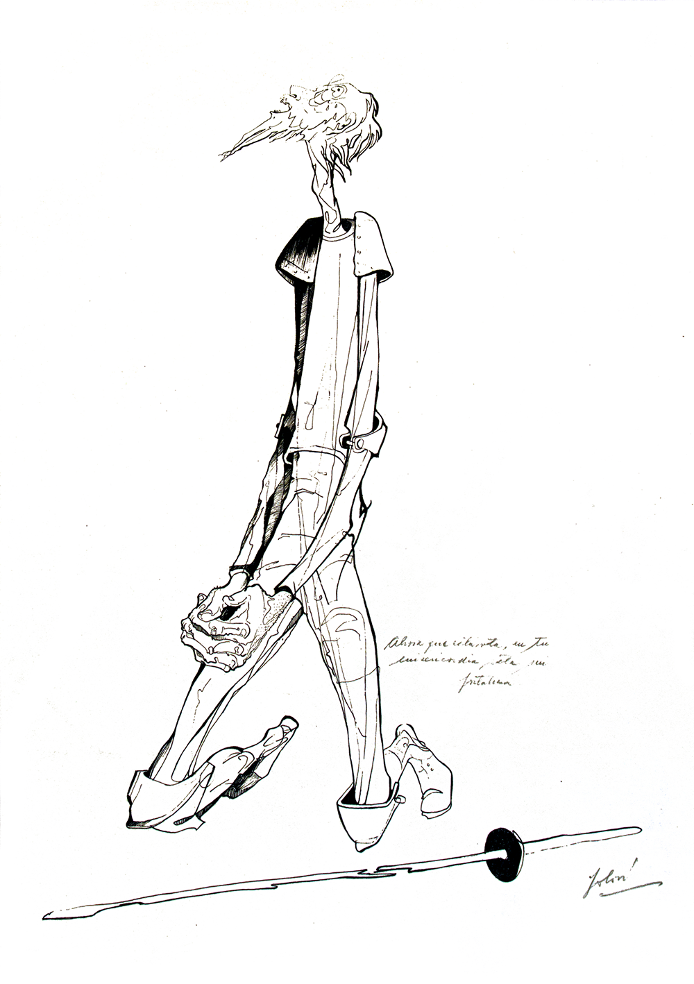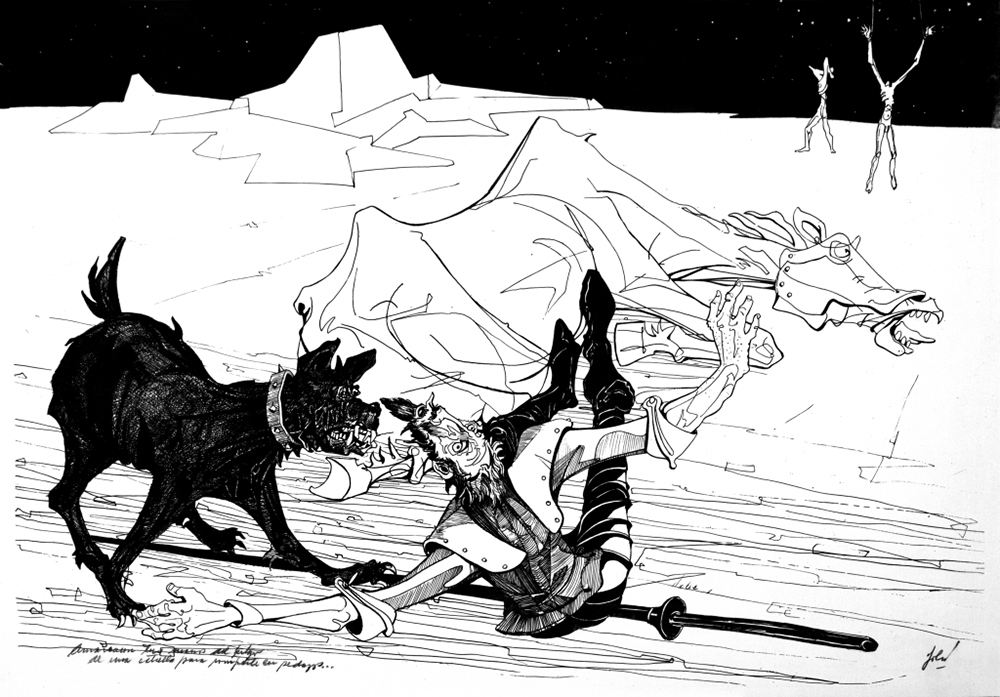 The series “Don Quixote and the dogs” was exhibited for the first time in the year 1974 during the military dictatorship of Banzer. Here we find a Don Quixote who rebels against the injustice and repression represented by the dogs. He is a tenacious Don Quixote who is sometimes downcast but always stands to continue his tireless struggle for freedom and justice.