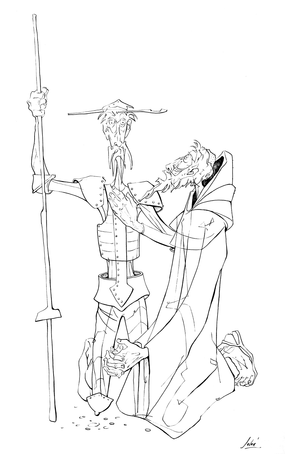 These images are part of the first series of Don Quixotes drawn by Solón (1965-1968). Before this series, Solón drew and painted several Quixotes with different themes, the most notable being the Quixote of three heads that looks at the past, present and future of education in the mural “Message to the teachers of the Future” (1954).