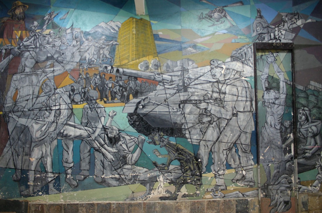 Solón empezó a pintar este mural con sus alumnos de pintura mural en la carrera de artes plásticas de la Universidad Mayor de San Andrés de la ciudad de La Paz. El mural recuerda el golpe del coronel Natusch Busch del 1 al 15 de noviembre de 1979. Este golpe militar, que se dio a los principios de la apertura democrática, dejó un centenar de muertos y medio millar de heridos. A pesar de los tanques y los disparos desde un helicóptero hubo grandes protestas y una heroica resistencia que acabó derrotando el golpe.