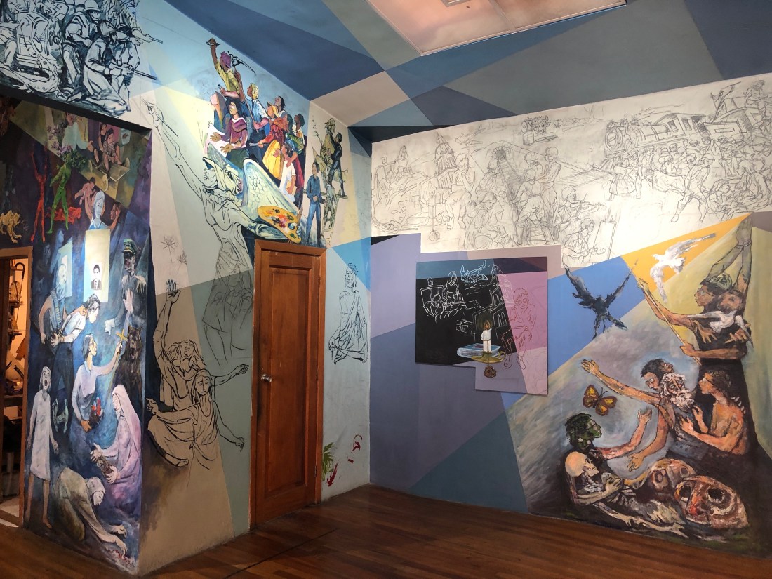 El mural autobiográfico empieza con la imagen de la torre del reloj de Uyuni y los dibujos que les hacía su padre en los cuáles escuchó por primera vez hablar del Quijote. Después está la representación de la muerte de su madre. Mas adelante hay una imagen de su “primer mural” cuando de niño hizo un dibujo en la pared de su hermana Sara. Al lado está la imagen de su hermano Goyo reproduciendo un billete de 20 bolivianos para mostrar lo que es ser un buen artista.