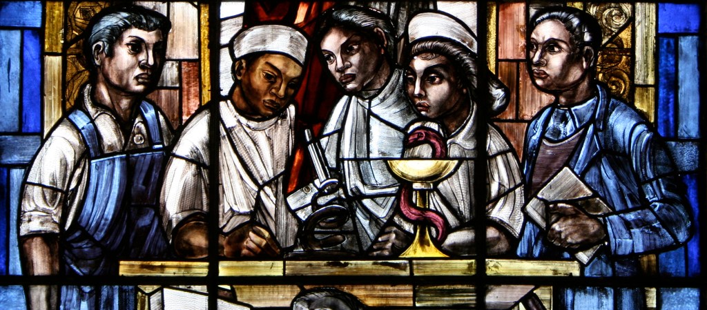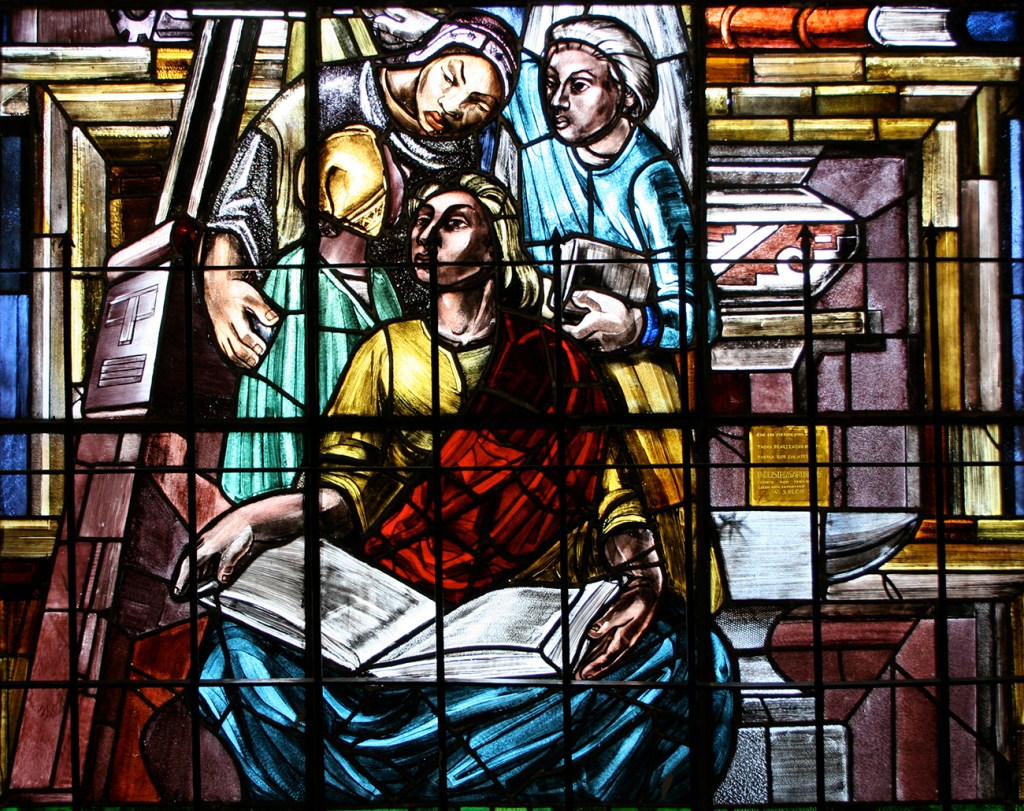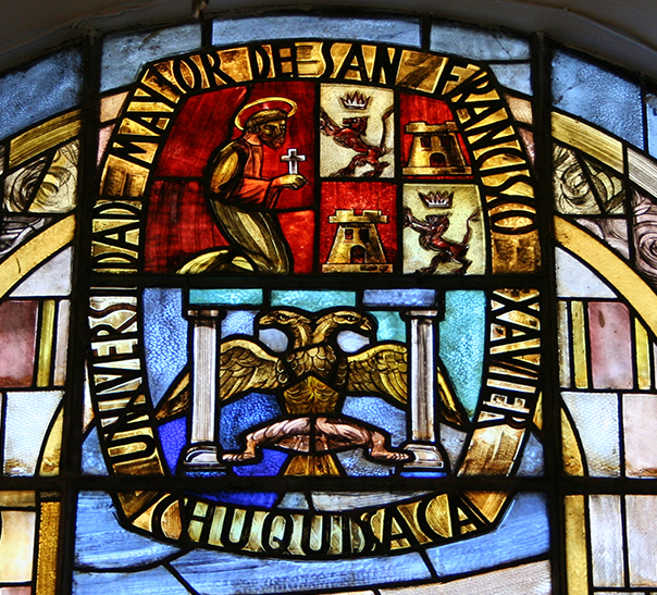 This stained glass window, located in the Universidad Mayor de San Francisco Xavier of Sucre, was designed and painted in its main fragments by Solón in 1950, and made in the stained glass workshops of Coroico, La Paz, directed by the Dutch stained glass artist Federick Geuer.